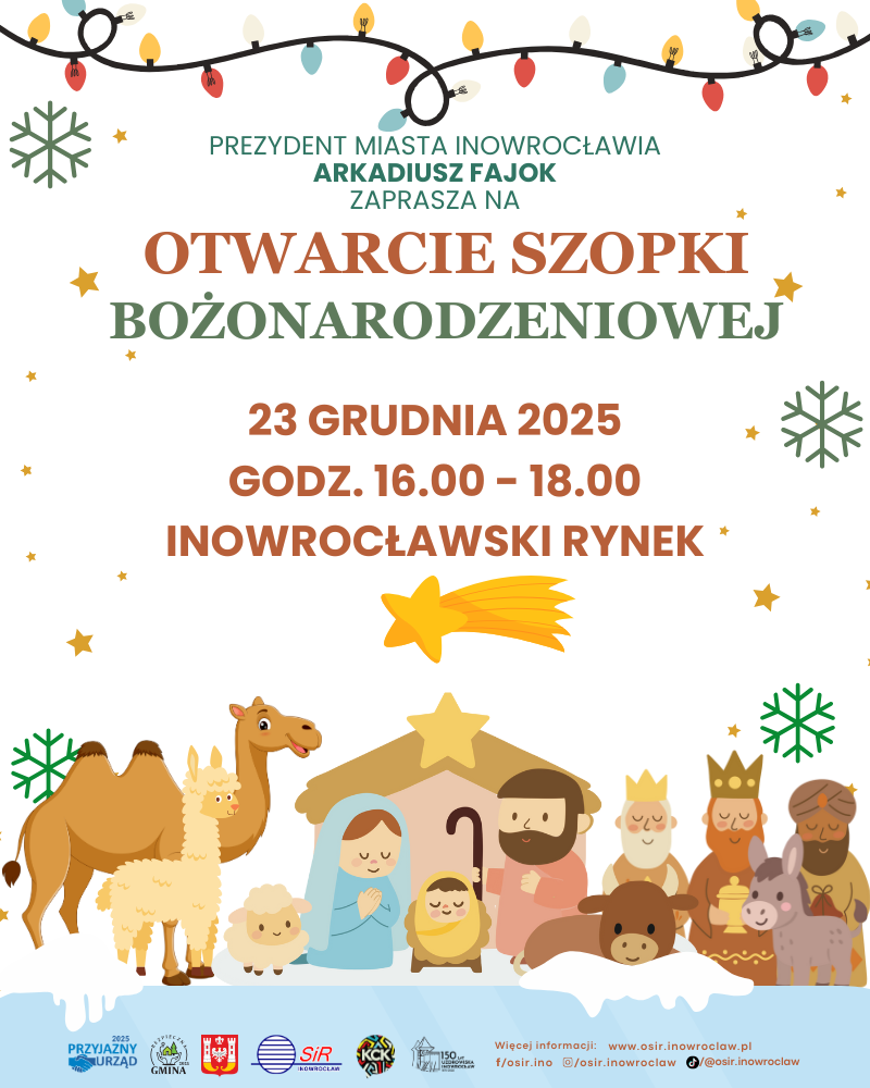 Prezydent Miasta Inowrocławia, Arkadiusz Fajok, serdecznie zaprasza na otwarcie szopki bożonarodzeniowej, które odbędzie się 23 grudnia 2025 r. o godz. 16.00 na inowrocławskim Rynku.